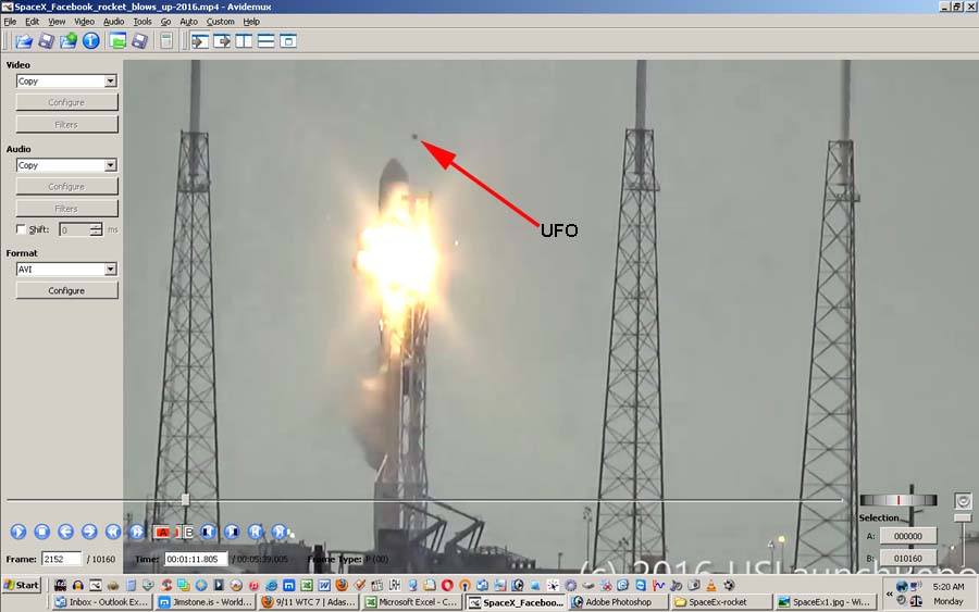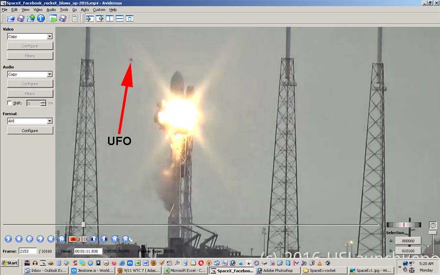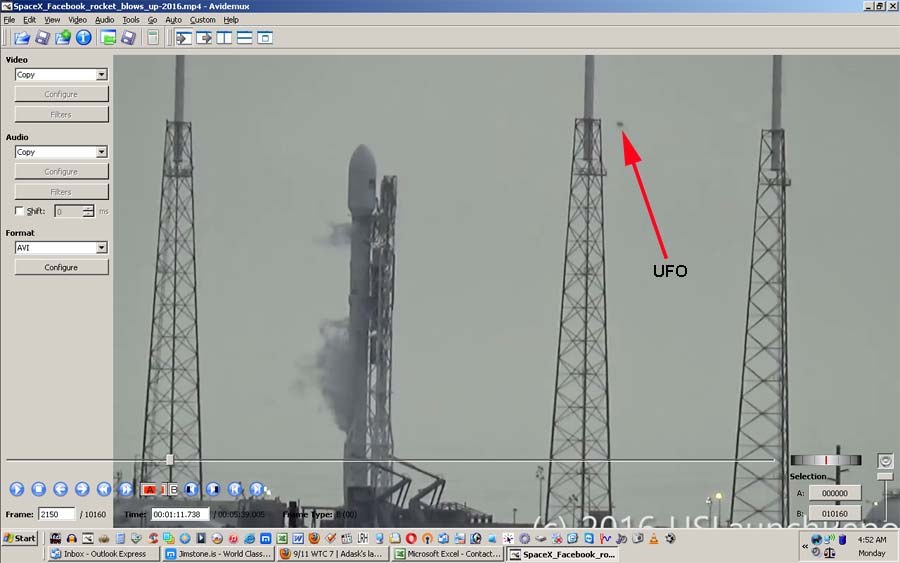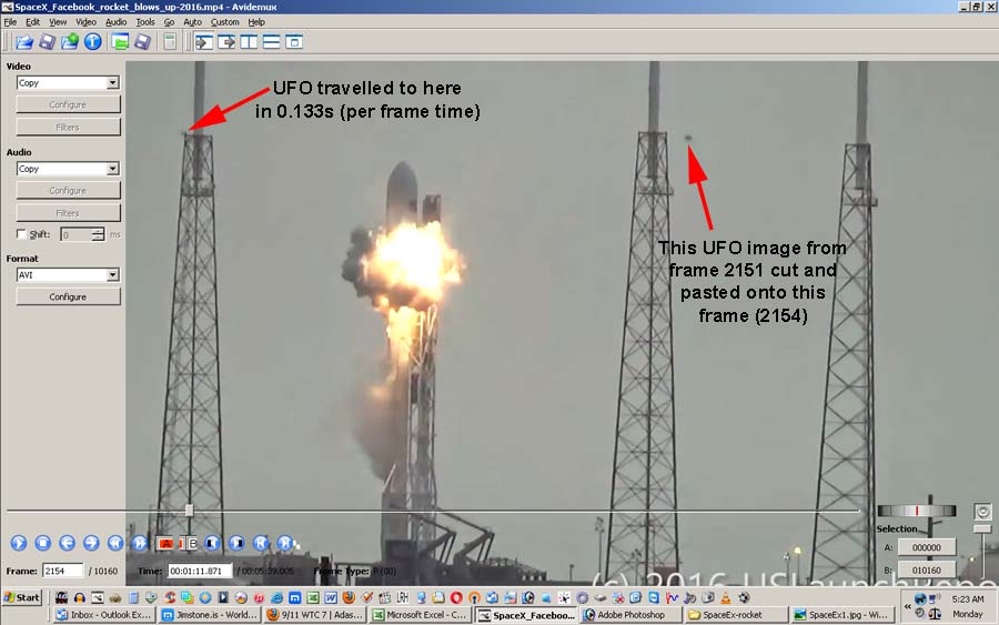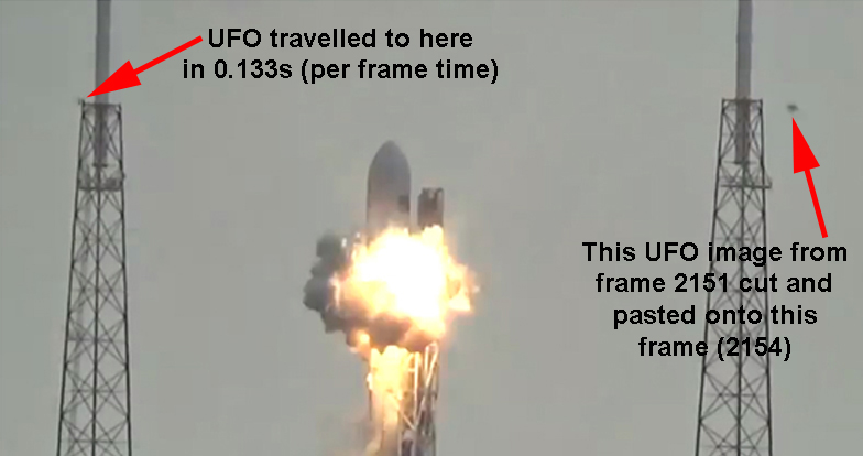 Distance of camera/observer from rocket can be determined by counting how many seconds after explosion one can hear it. Convert to Meters. Time (t) = to initial explosion = 6.96 (11.96s for later big one) Frames with 'UFO' in it: ![]() ![]() ![]() ![]()