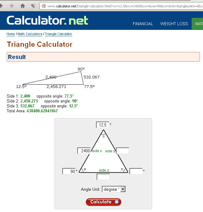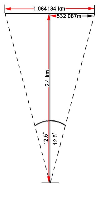 You can see that the rocket is nearly perfectly half-way between the two images of the UFO. So we can use simple trigonometry to calculate the distance between the two points (2.4km converted to meters):